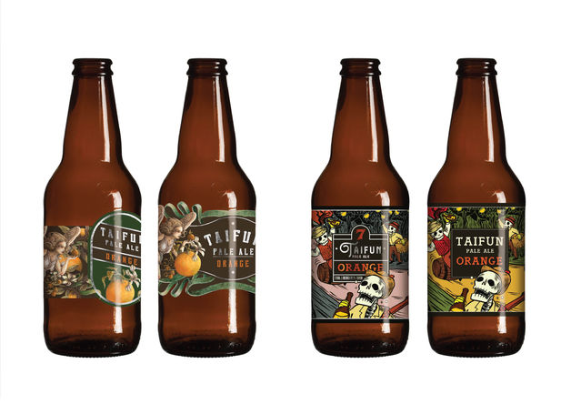 Label design for 7Taifun Pale Ale. Two of the design alternatives are illustrated with very different style of illustrations. The skeleton designs are more fun and modern, whereas the angel design looks more classy and sophisticated, Both are made using traditional medias (watercolor, pencil and marker) and then scanned and edited digitally.